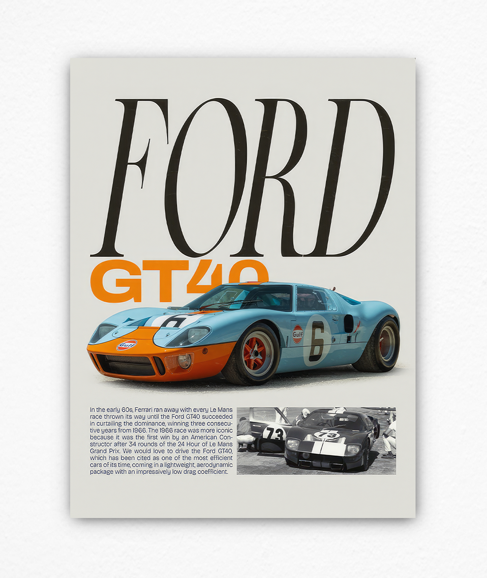 Transform your space with this premium quality Ford - GT40 poster in a standard size 10x13 wall frame. Relive the excitement and nostalgia of vintage cars with this beautifully framed print. Perfect for any car enthusiast or as a unique piece of decor.