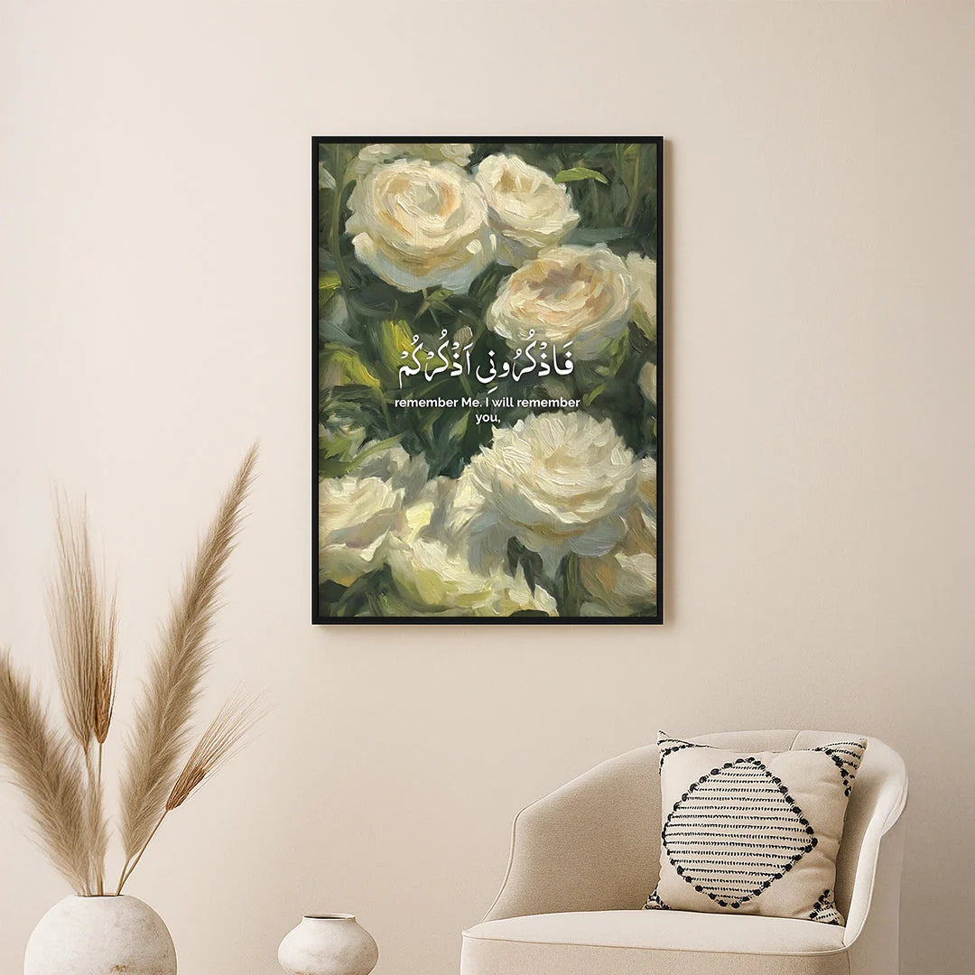 inspired by the sacred verse, ‘So remember Me; I will remember you’ (Qur'an 2:152), this piece blends the beauty of floral creation with the power of divine remembrance. Let it be a gentle presence in your home - a reminder that in every moment of dhikr, Allah is near. A garden for the soul, where faith blossoms with every glance.