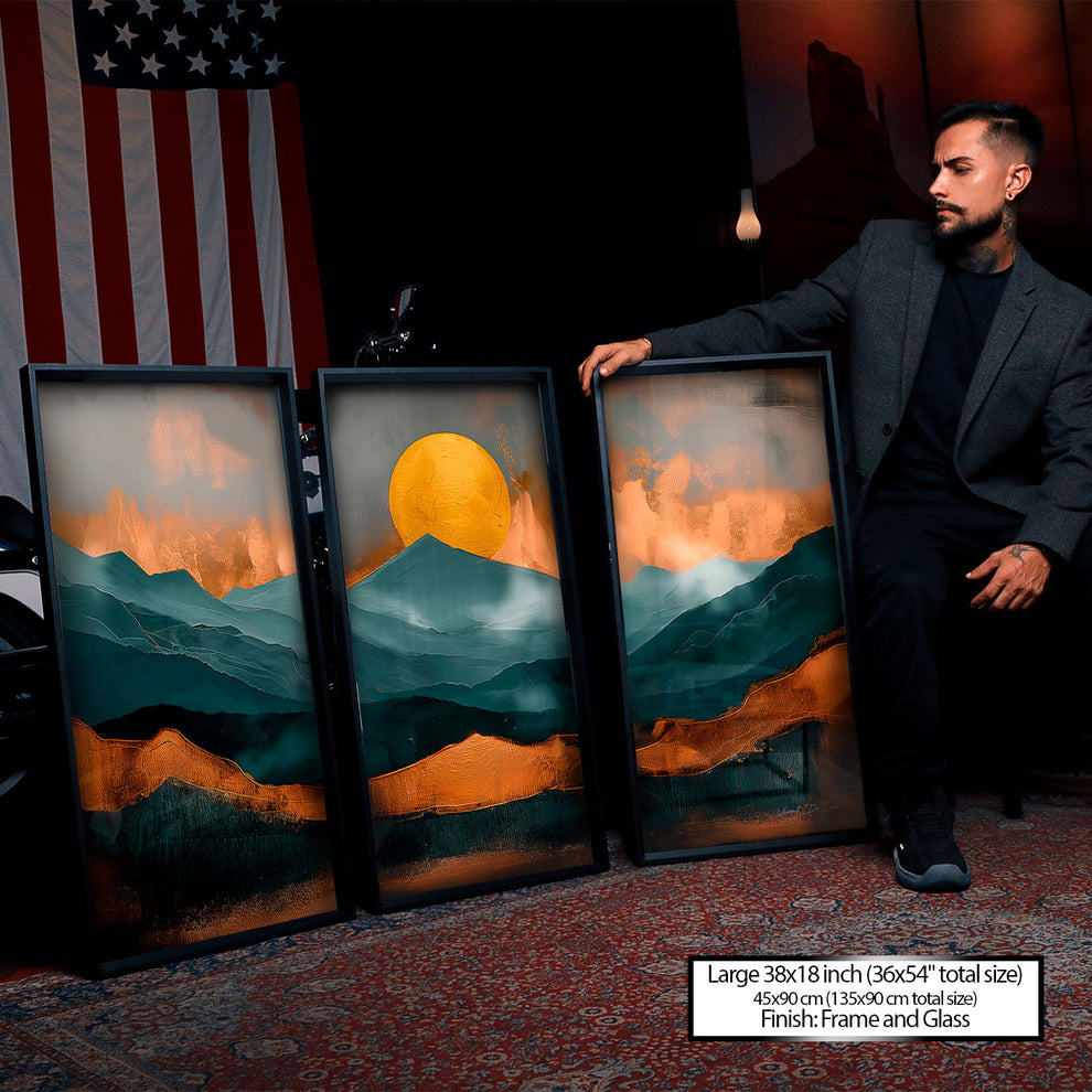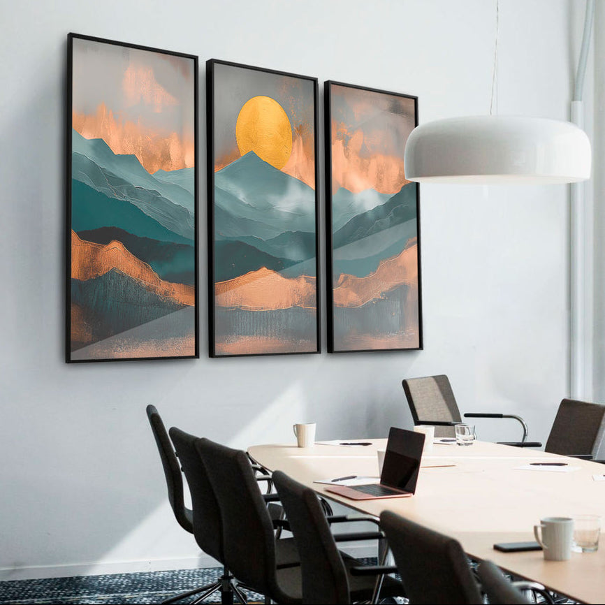 An abstract sun rises above layered mountain forms, symbolizing energy, hope, and new beginnings. The composition balances light and shadow through softened shapes and textured gradients, reflecting harmony between strength and calm. Flowing lines unify the elements, creating a sense of timeless connection and serenity.