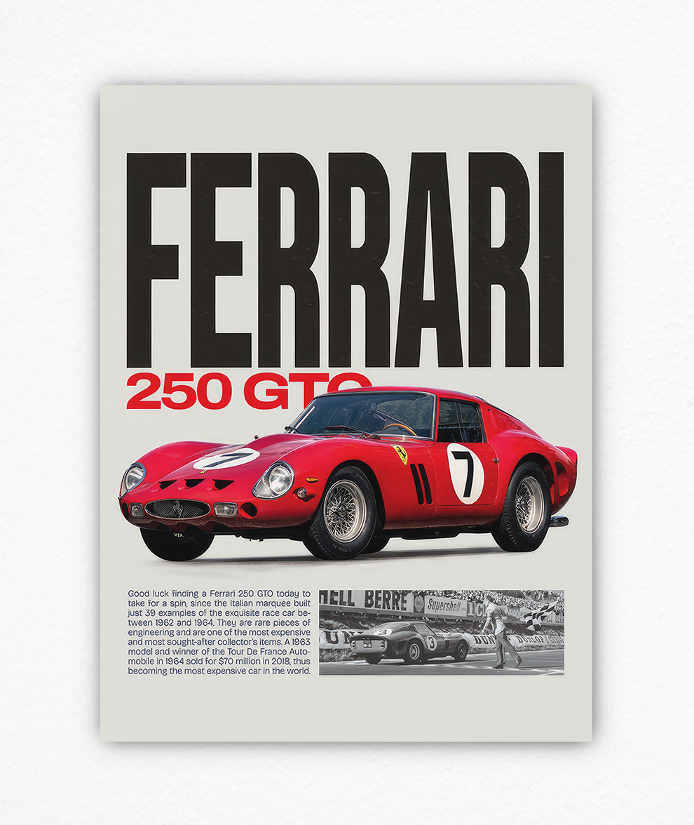 Rev up your home decor with the Ferrari 250 GTO poster! Featuring the iconic design and power of the legendary Ferrari, this poster is sure to inspire awe and excitement in any car enthusiast. Bring the thrill of the race into your home with this stunning piece of art. Limited stock available, so get yours now!