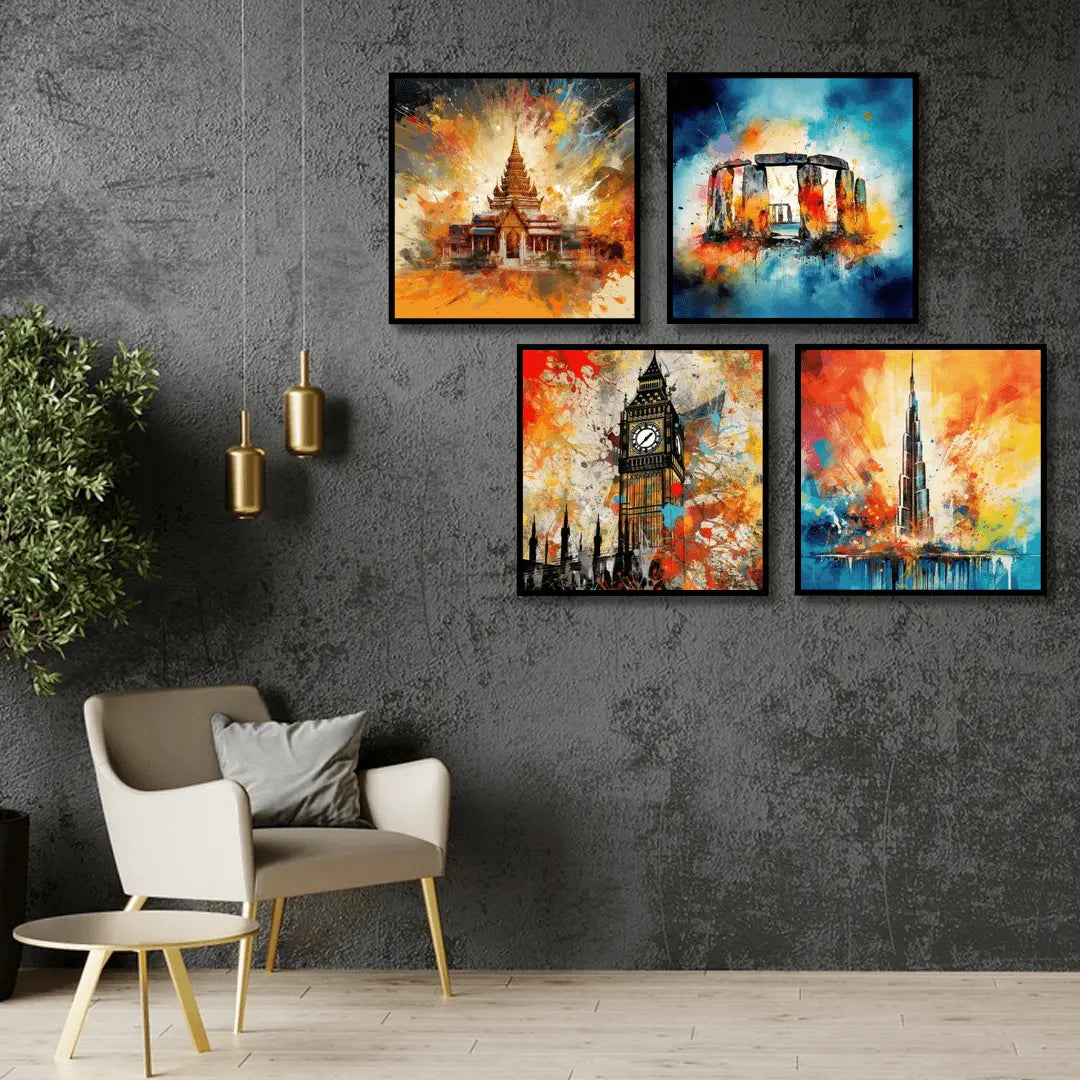 Elevate your interior with the Temple, Stonehenge, Clock Tower & Burj Khalifa 4-Panel Wall Art. This captivating piece showcases four iconic structures, seamlessly bringing together history and modernity. Each panel represents a unique architectural marvel, from the ancient majesty of Stonehenge to the contemporary brilliance of Burj Khalifa. Perfect for both home and office settings, this wall art painting serves as a stunning focal point that sparks conversation and admiration.