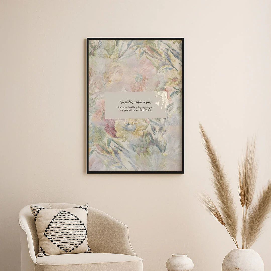 A soft, floral embrace for the soul - this piece draws from the hopeful promise of Surah Ad-Duha (93:5), a verse that speaks directly to the heart in moments of uncertainty. Let it be a constant reminder in your space: Allah’s gifts are not only near, but perfectly timed. He sees, He knows, and He will give until your heart is content. Patience now, peace soon.